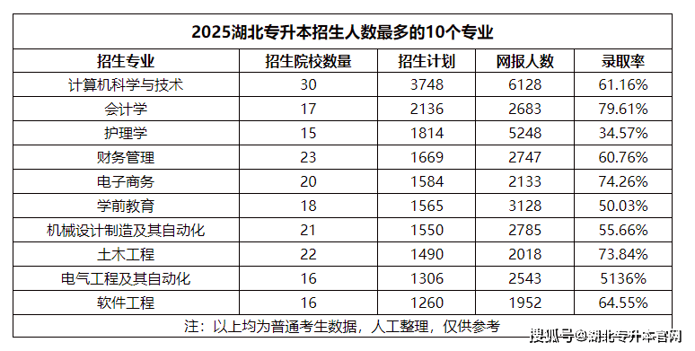 按照2025年湖北专升本报考数据,小编汇总了报考人数前十的专业,包含了计较机,会计学,护理学,学前教育,土木匠程等专业。抢手专业中工程类专业占从导地位,而从动化、机械工程等保守工程类专业仍受青睐。