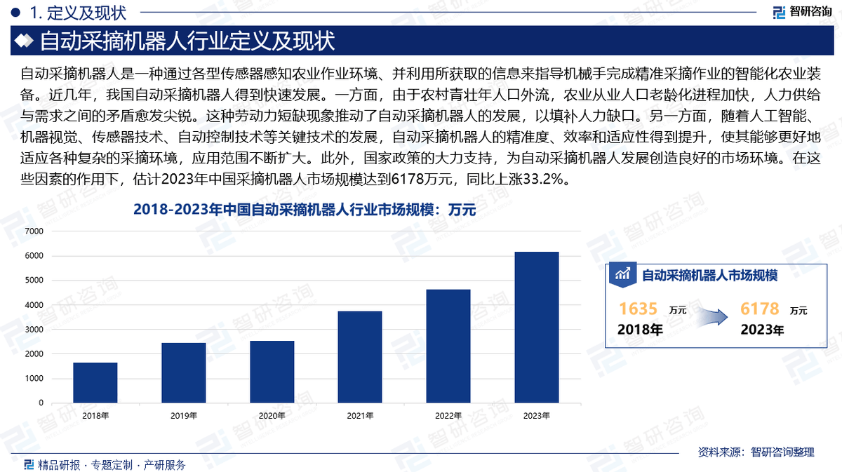 我国从动采摘机械人最早可逃溯到20世纪90年代,但从国际上来看,一些以日本和美国为代表的发财国度,曾经从20世纪80年代起头研究采摘机械人,并取得了一些。取国外比拟,我国从动采摘机械人的研究工做具有起步晚,成长慢,投资少的特点。但近几年,我国从动采摘机械人获得快速成长。一方面,因为农村青丁壮生齿外流,农业从业生齿老龄化历程加速,人力供给取需求之间的矛盾愈发锋利。这种劳动力欠缺现象鞭策了从动采摘机械人的成长,以填补人力缺口。另一方面,跟着人工智能、机械视觉、传感器手艺、从动节制手艺等环节手艺的成长,从动采摘机械人的精准度、效率和顺应性获得提拔,使其可以或许更好地顺应各类复杂的采摘,使用范畴不竭扩大。此外,国度政策的鼎力支撑,为从动采摘机械人成长创制优良的市场。正在这些要素的感化下,估量2023年中国采摘机械人市场规模达到6178万元,同比上涨33。2%。