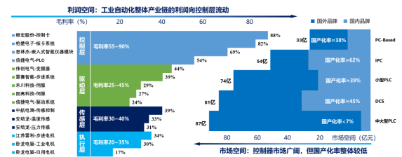 工业从动化节制层设备次要包罗单片机、PC-Based节制卡、IPC、DCS及PLC等产物,分歧类型的工业从动化节制层产物正在手艺特点上存正在较着的区别。全体而言,工业从动化节制层产物正在工控系统中承担“大脑”的脚色,需要及时、节制驱动层、施行层等承担“四肢”脚色的设备,正在一个功能完整的工控系统中节制层产物的数量较少但具有主要的功能,因而全体而言工业从动化财产链中的利润空间向节制层产物集中。以行业内代表性上市公司为例,施行层设备的毛利率程度集中正在20%至35%,传感层设备的毛利率程度集中正在30%至40%,驱动层设备的毛利率程度集中正在25%至45%,而节制层设备的毛利率程度能够达到55%至90%的程度。