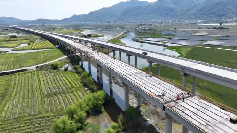 省交通集团瑞苍批示部工程处处长 金建敏:目前(土建)02标正正在进行从属工程的一些收尾,现正在正在做的就是桥面系的施工,也是为下一步沥青面(铺设)做一个铺垫预备。